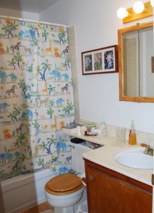 Then it became a pressing matter to re-do the flooring because our splash-happy boys were getting water all over and several planks of wood laminate were starting to lift. Thank goodness the damage did not go under the cabinets or the tub so we do not have to replace either. The ugly orange brown vanity and medicine cabinet were painted a rich chocolate brown and the animal-themed curtain gave way to a rice paper print curtain.