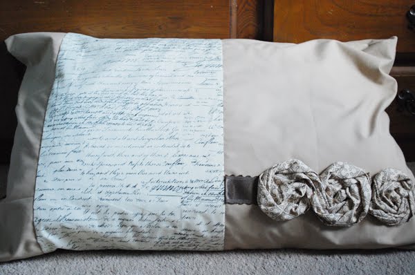 These are bedroom accent pillows, the large one is a sham-sized cover but I don’t like the ruffle all around so I mixed fabrics and added rosettes. The small one is a copy of similar covers I’ve seen all around the blogosphere, I love the ruffly goodness on the plain tan fabric.